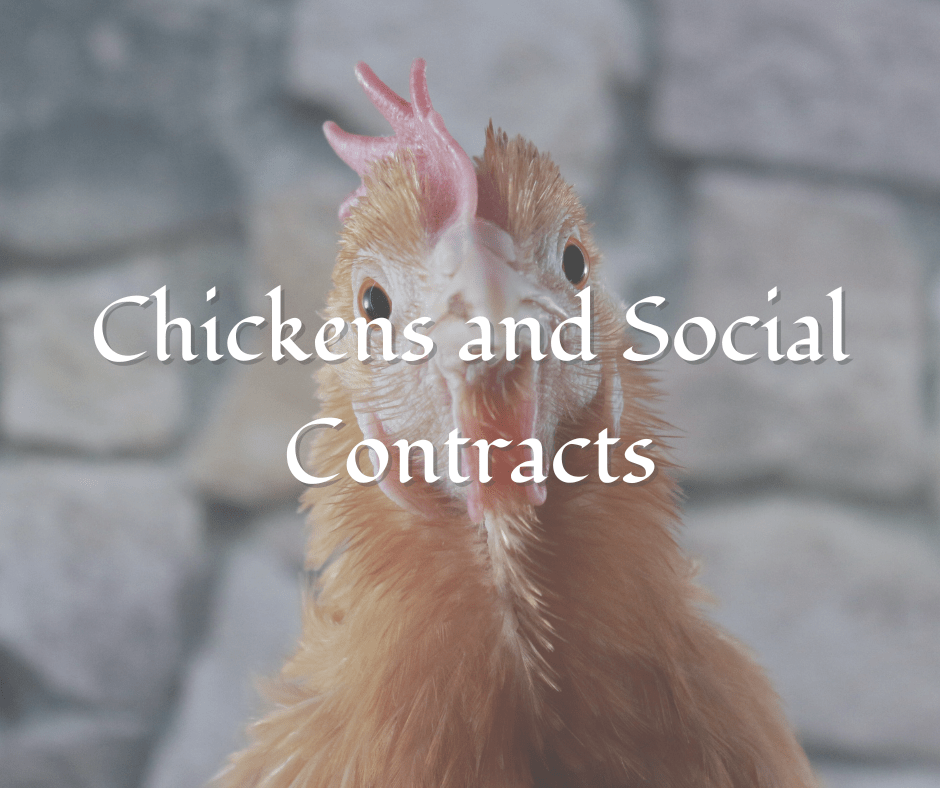 In a previous post, I pondered man's resistance to authority and said that we tend to tolerate it when there is a perceived benefit. This is an example of a social contract. We have unconscious social contracts all around us in everyday life. For example, in my backyard, a solemn pact governs our family's relationship… Continue reading Chickens and Social Contracts